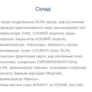 СКЛАД: глюкозно-фруктозний сироп, глазур кондитерська 25% (цукор, жир рослинний, какао – порошок, емульгатор СОЄВИЙ лецитин, ароматизатори: «Шоколад», «Ванілін»), концентрат СИРОВАТКОВОГО БІЛКУ 10%, ізолят СОЄВОГО БІЛКУ 10%, смородина чорна сушена (смородина чорна, консервант Е220) 6%, МОЛОКО сухе знежирене, КАЗЕЇНАТ натрію 3,5%, вологоутримуючий агент гліцерин, загущувач крохмаль кукурудзяний сухий, ароматизатор «Лісові ягоди», регулятор кислотності лимонна кислота, консервант сорбінова кислота, барвник «Фіолетовий». Може містити сліди АРАХІСУ та ГОРІХІВ.