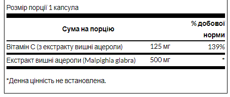 Ви можете бути знайомі з більш солодкими вишнями Бінг і Реньє з продуктового магазину, але саме вишня ацерола лідирує в цій групі фруктів за вмістом вітаміну С. Усього 2/3 чашки можуть містити до 4000 мг вітаміну С, а одна вишня містить набагато більше вітаміну С ніж апельсин! Наші капсули Swanson Premium Acerola є потужним джерелом цього важливого антиоксиданту для імунітету.