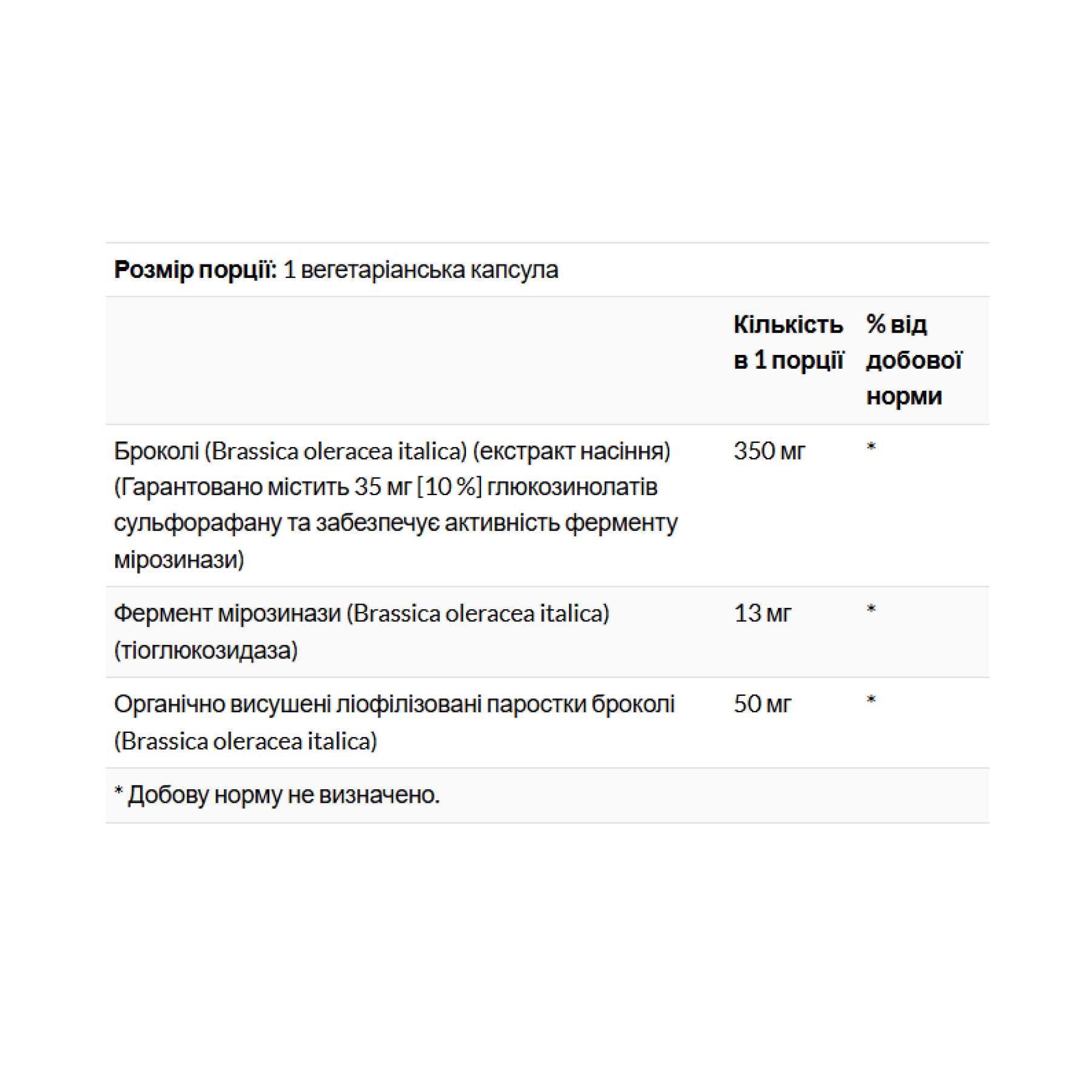Інформація про продукт. Броколі — хрестоцвітний овоч з родини бразикових. Броколі містить унікальний клас фітохімікатів, відомих як глюкозинолати, включаючи глюкорафанін. Під час вживання броколі, жування розщеплює глюкорафанін за підтримки ферменту, який називається мірозиназа. При змішуванні глюкорафаніну та мірозинази утворюється сполука, відома як сульфорафан. Екстракт насіння броколі Solaray® активує фермент мірозинази для підтримки цього процесу. Ліофілізовані паростки броколі додають до цієї формули, оскільки вони містять як глюкозинолати, так і ферменти мірозинази.