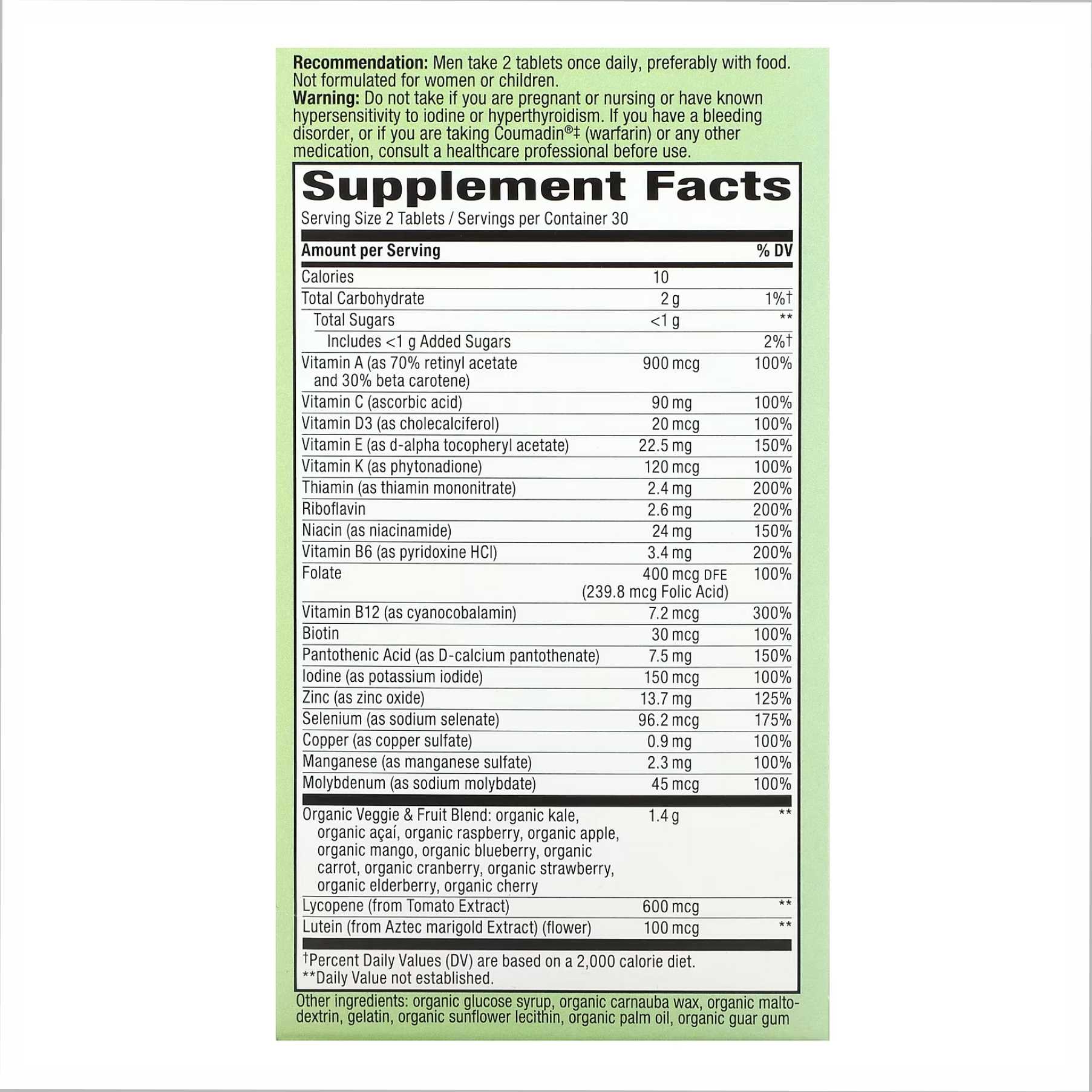 †1,4 г суміші овочів і фруктів на порцію. Кожна порція з 2 таблеток забезпечує еквівалент 1 склянки листової зелені (об’єм до висушування).