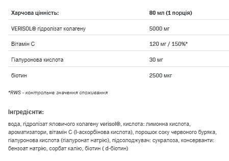 Щоб виправдати ваші очікування, ми підготували ваш улюблений колагеновий продукт COLLAROSE у формі зручного шоту. Кожна пляшка об'ємом 80 мл містить повну порцію готового до вживання малиново-полуничного смаку COLLAROSE SHOT, який ви завжди можете мати із собою. Якщо час для вас безцінний або ви не любите «грати» у приготуванні та розчиненні добавок у вигляді порошку, ця форма прийому для вас. Дія та ефективність обох продуктів абсолютно однакові, оскільки дози всіх активних інгредієнтів, тобто. пептиди колагену, вітамін С, біотин, гіалуронова кислота в одній порції в обох продуктах ідентичні. Продукція відрізняється лише формою подачі. Шот – це готовий до споживання напій, а порошкоподібний варіант слід розчинити у склянці води. 1 постріл – це 1 мірна ложка порошку. Решта інгредієнтів та принцип дії COLLAROSE SHOT такий самий, як і для порошку COLLAROSE. Колаген – це форма білка, який є основною сполучною речовиною, яка зв'язує клітини нашої шкіри, і становить до 80% її сухої маси. Завдяки колагену наша шкіра стає пружною та гладкою. Нестача колагену в достатній кількості найбільш помітна на обличчі та шиї з такими ознаками, як зморшки та борозни. Потім шкіра обвисає і провисає, бо зі втратою колагену вона втрачає свою еластичність.