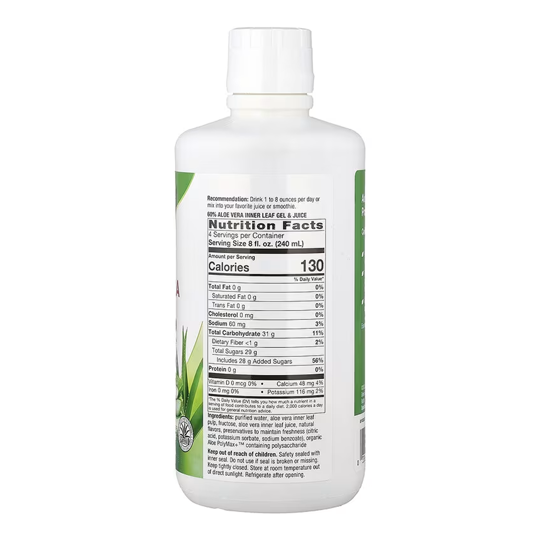 Очищена вода, м’якоть внутрішнього листя алое вера, фруктози, сік листя алое, натуральні ароматизатори, консерванти для збереження свіжості (лимонна кислота, сорбат калію, бензоат натрію), органічний алое PolyMax+™, що містить полісахарид.