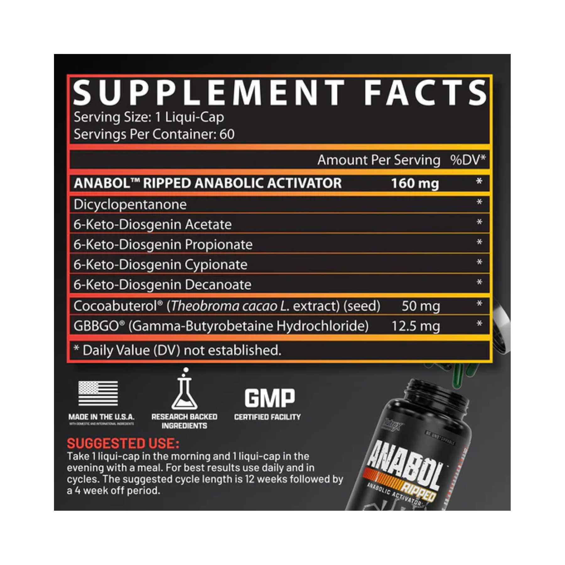 Набирайте масу та зберігайте твердий, подрібнений вигляд – з ANABOL RIPPED – передовою формулою, розробленою для тих, хто хоче серйозно наростити м'язову масу, скидаючи небажаний жир. Ця електростанція «два в одному» поєднує хардкорні сполуки для нарощування м’язів із двома ефективними агентами, що спалюють жир, тож ви можете створити струнке м’язисте тіло. Завдяки передовій технології рідинної кришки ANABOL RIPPED забезпечує швидку доставку та поглинання своїх потужних інгредієнтів. Вони допомагають створити оптимальне анаболічне середовище для посиленого росту та відновлення м’язів, але також активізують ваш метаболізм для більш ефективної втрати жиру. Чи готові ви до трансформації, яка принесе найкраще з обох світів – величезні досягнення та подрібнений вигляд? Отримайте свій перший цикл ANABOL RIPPED зараз і відчуйте максимальну синергію неперевершеного росту м’язів і втрати жиру!