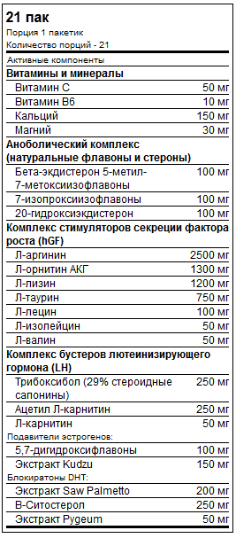 Animal M-Stak«наслідує» ефект від використання анаболічних лікарських засобів шляхом поліпшення протеїнового синтезу, затримки азоту (позитивний баланс азоту) і розподілу поживних речовин (звернення більшої кількості поживних речовин у чисту масу), при цьому одночасно зменшуючи м'язовий катаболізм. Як? Animal M-Stak допомагає організму збільшити виробництво всіх п'яти анаболічних гормонів, це: (1) Тестостерон; (2) Людський гормон зростання (hGH); (3) Інсуліноподібний фактор росту 1 (IGF-1); (4) Лютеїнізуючий гормон (LH); (5) Інсулін. Найкрасивіше, що Animal M-Stak працює без андрогенних побічних ефектів, що супроводжують прогормональний курс і негативно впливають на печінку.