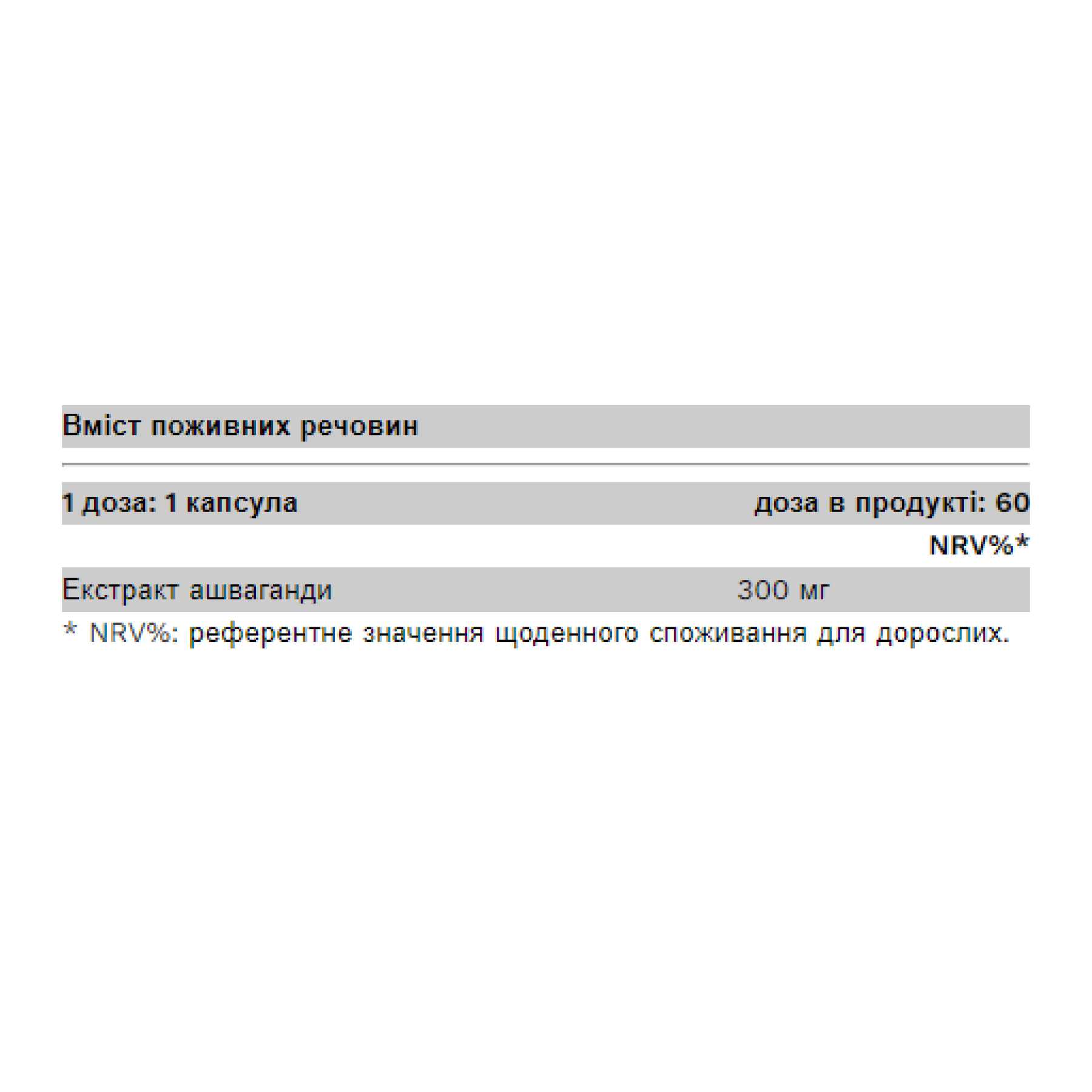 Інгредієнти: восковий кукурудзяний крохмаль, гіпромелоза, екстракт KSM-66 ® Withania Somnifera Dunal (корінь) 12:1 [ KSM-66 ® є зареєстрованою торговою маркою Ixoreal Biomed Inc. ] , засіб проти злежування (стеарат магнію).