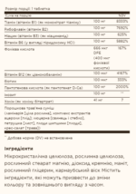 Не містить глютену, пшениці, молочних продуктів, сої, дріжджів, цукру, натрію, штучних ароматизаторів, підсолоджувачів, консервантів і барвників.