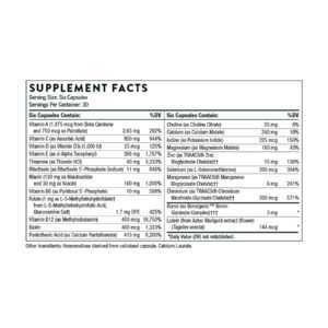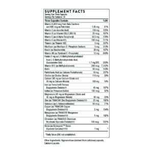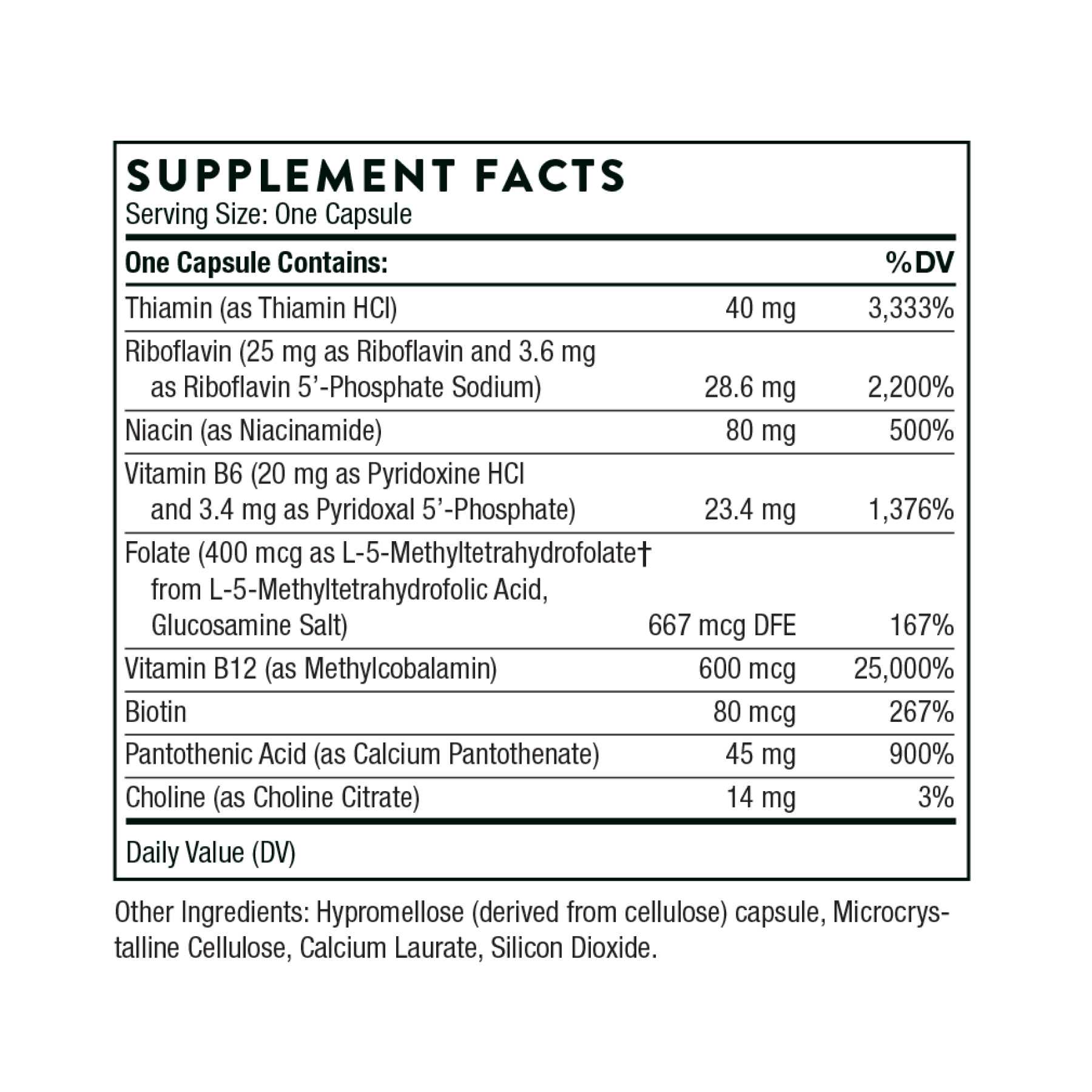 B Complex 12 містить вісім водорозчинних вітамінів групи B: тіамін (вітамін B1); рибофлавін/рибофлавін 5'-фосфат (вітамін В2); ніацинамід (вітамін В3); пантотенова кислота (вітамін В5); піридоксин/піридоксаль 5'-фосфат (вітамін В6); метилкобаламін (вітамін В12); 5-MTHF (фолат); і біотин; плюс холін. Незважаючи на те, що кожен вітамін групи В хімічно відрізняється, вони часто діють синергетично в різних біохімічних функціях в організмі – від виробництва клітинної енергії до формування здорових еритроцитів і здорової неврологічної функції.*