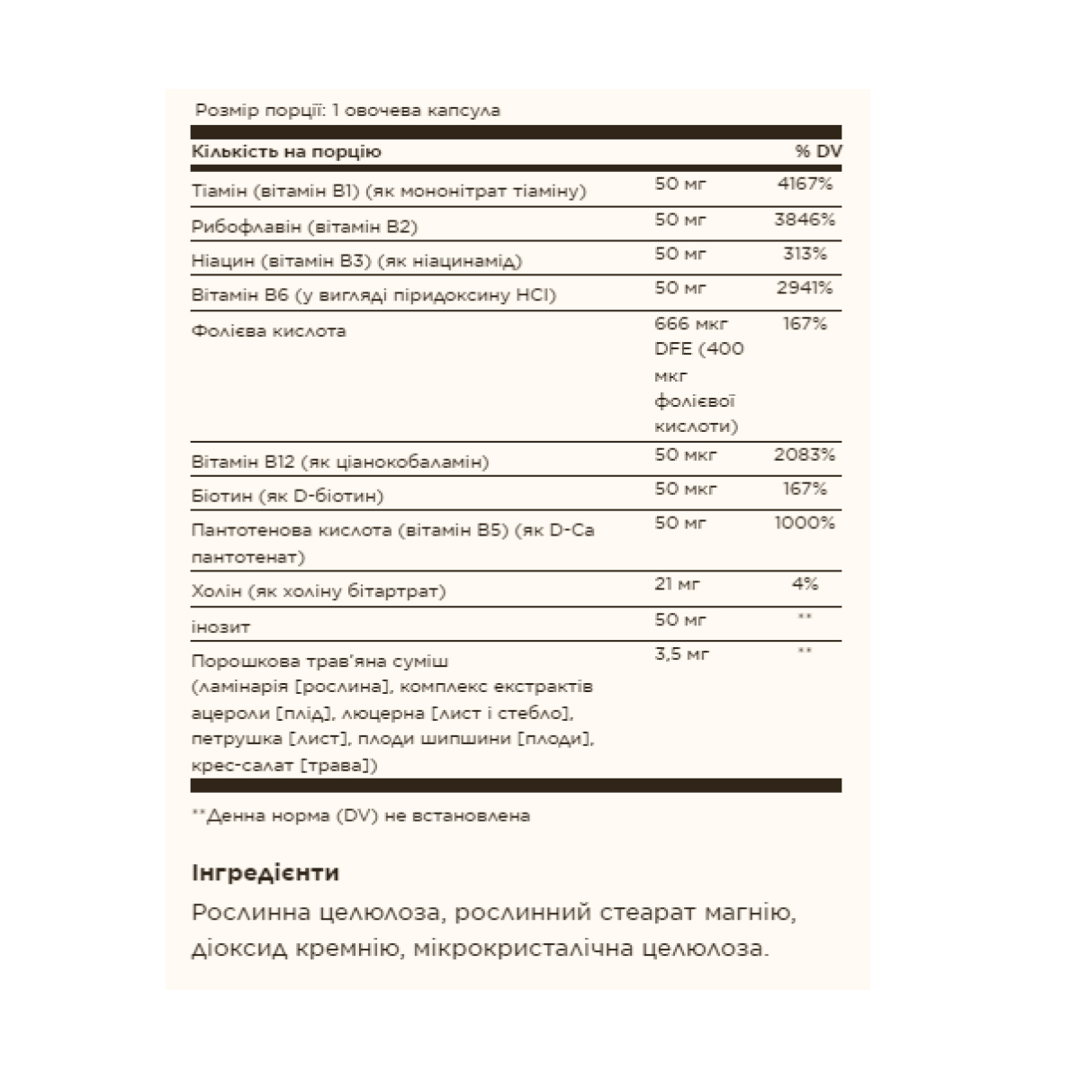 Кожна необхідна поживна речовина в комплексі вітамінів групи B виконує унікальну роль у збереженні нормального обміну речовин, і одночасно надає поживну підтримку організму під час повсякденних стресів. Комплекс вітамінів групи В необхідний для обміну вуглеводів, жирів і білків, які перетворюють їжу в енергію. Крім того, ці вітаміни відіграють важливу роль для збереження здоров'я серцево-судинної системи, нервової системи і для формування еритроцитів (червоних клітин крові).