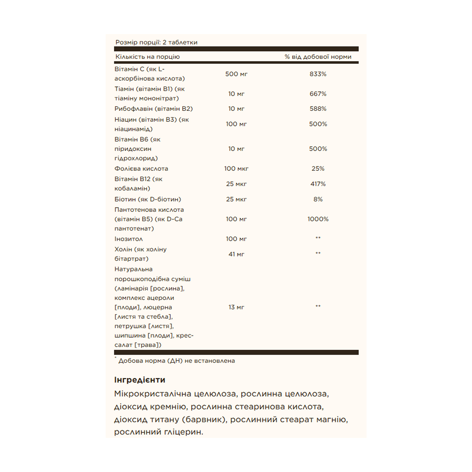 Мікрокристалічна целюлоза, целюлоза (рослинного походження), стеаринова кислота рослинного походження, діоксид кремнію, рослинний стеарат магнію, рослинний гліцерин, карнаубський віск.