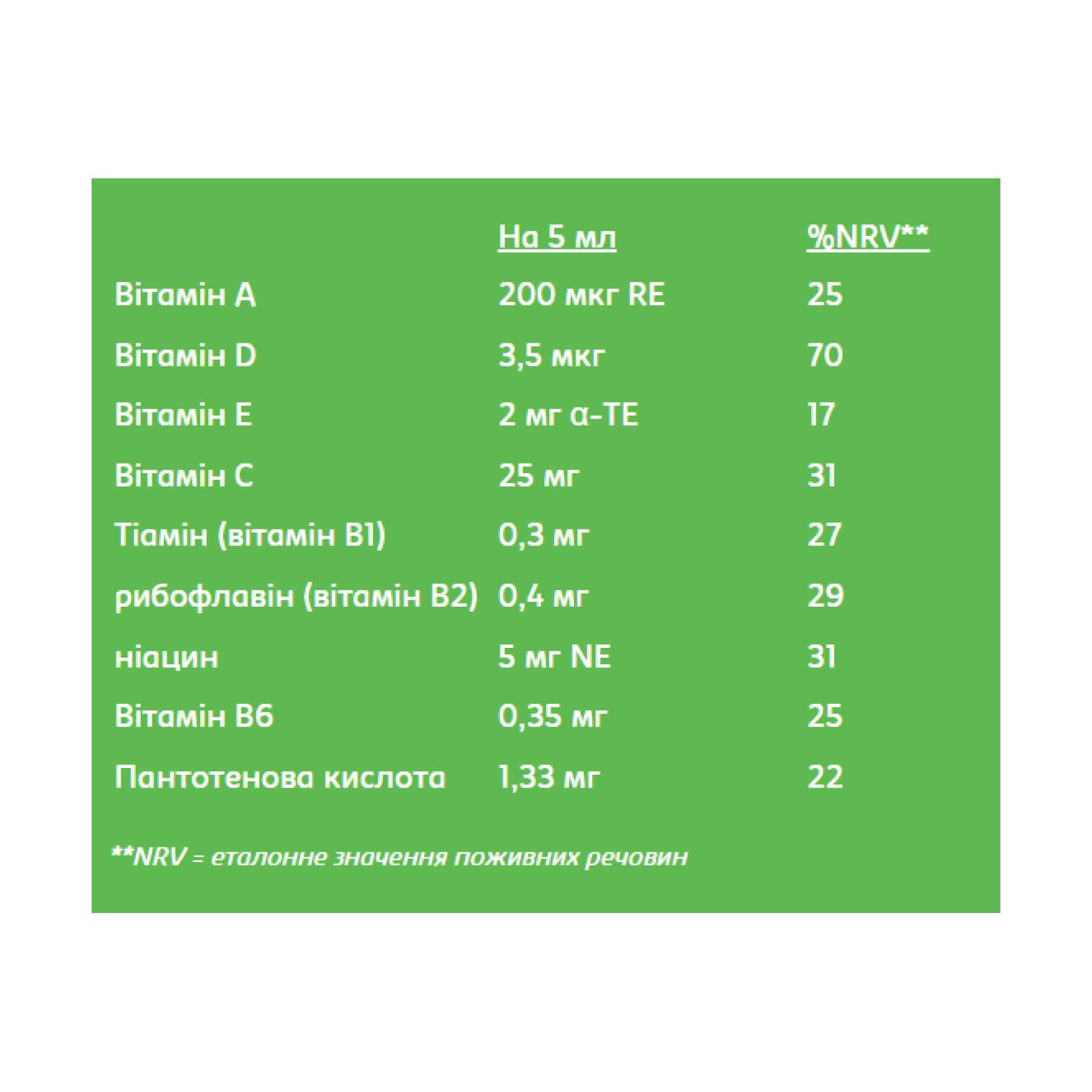Вода, гліцерин, аскорбінова кислота, регулятори кислотності: цитрат натрію, лимонна кислота, стабілізатор: ксантанова камедь, ніацинамід, ароматизатор: апельсинова олія, хлорид натрію, консервант: сорбінова кислота, вітамін Е, D-пантенол, вітамін В2, препарат вітаміну А. (Вітамін A пальмітат, DL альфа-токоферол), вітамін B1, вітамін B6, вітамін D Prep. (Фракціонована рослинна олія, вітамін D, альфа-токоферол DL)