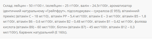 Амінокислоти BCAA 2:1:1 Power Pro BCAA 2:1:1 це спортивне харчування від Power Pro. Виробники препарату славляться у колах спортсменів через високу якість добавок. BCAA 2:1:1 Power Pro це комплекс, що діє, що має різні смаки і складається з поживних елементів. Добавка включає до складу лейцин, валін та ізолейцин, які змішані у пропорції 2:1:1. Ці компоненти допомагають прискорити відновлення після занять спортом, а також прискорити зростання м'язової маси. Амінокислоти допоможуть зарядитися енергією та тонізувати організм. Крім того, вони зміцнять імунну систему. Ознайомимося з перевагами добавки: швидка адаптація до високих навантажень; антикатаболічний ефект; прискорення зростання м'язів та підвищення силових показників. Рекомендації щодо застосування Розмішайте 5 г (1 чайна ложка) BCAA у воді або соку. Вживайте суміш двічі на день після тренування та перед. Примітка: продукція не стосується ряду лікарських засобів. індивідуальна непереносимість інгредієнтів продукту. Рекомендується вживати тільки особам старше 18 років, не рекомендується продукт вагітним і жінкам, що годують. Перед вживанням проконсультуйтеся з лікарем.