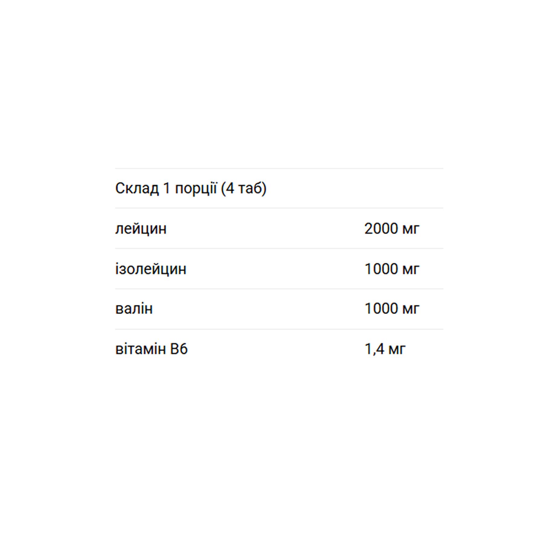 Інгредієнти: Розчинні BCAA 53,1% (L-лейцин, L-ізолейцин, L-валін, емульгатор: лецитин), наповнювач (гель целюлози), покривний матеріал [стабілізатори (полівініловий спирт-поліетиленгліколь-сополімер, полівініловий спирт), агенти, що перешкоджають злежуванню (тальк, моно- і дигліцериди жирних кислот)], агенти, що перешкоджають злежуванню (магнієві солі жирних кислот, діоксид кремнію), піридоксину гідрохлорид.