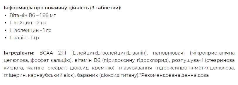 Добавка незамінних амінокислот, що містить оптимальне співвідношення лейцину, ізолейцину та валіну 2: 1: 1. Кожен з них природно міститься в білку, який допомагає нарощувати і відновлювати нові м'язи. Допомагає підтримувати тканини тіла Може збільшити м'язову масу Надзвичайно популярні амінокислоти Ці три незамінні амінокислоти не можуть вироблятися вашим організмом, тому вони повинні надходити з вашого раціону, що робить наші супер-зручні таблетки обов'язковими, незалежно від того, чи хочете ви набрати м'язову масу, підтягнути або схуднути. Він також включає незамінний вітамін B6, який допоможе вам залишатися в тонусі, – вашим захистом, – і завжди відчувати себе на висоті в тренажерному залі і поза ним.