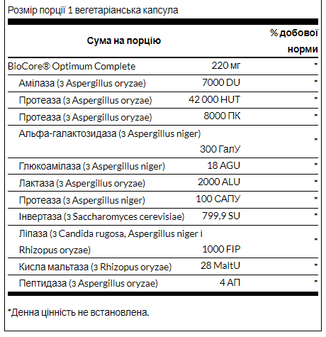 Травний фермент, отриманий із рослинних джерел Допомагає ефективніше розщеплювати їжу Підтримує травлення та всмоктування Остаточна формула ферменту тут! Swanson Ultra BioCore Optimum Complete містить ферменти для вирішення всіх аспектів ферментативного травного процесу, включаючи лактазу, що допомагає перетравлювати лактозу з молочних продуктів, альфа-галактозидазу, що допомагає розщеплювати певні цукру із зерна і овочів, і кислу мальтазу, що допомагає вашому організму. цукор у травному процесі. Кожен фермент у BioCore Optimum Complete допомагає підтримувати травний процес та сприяє його регулярності. Рекомендації щодо застосування: як харчова добавка приймайте одну рослинну капсулу з водою безпосередньо перед кожним прийомом їжі.