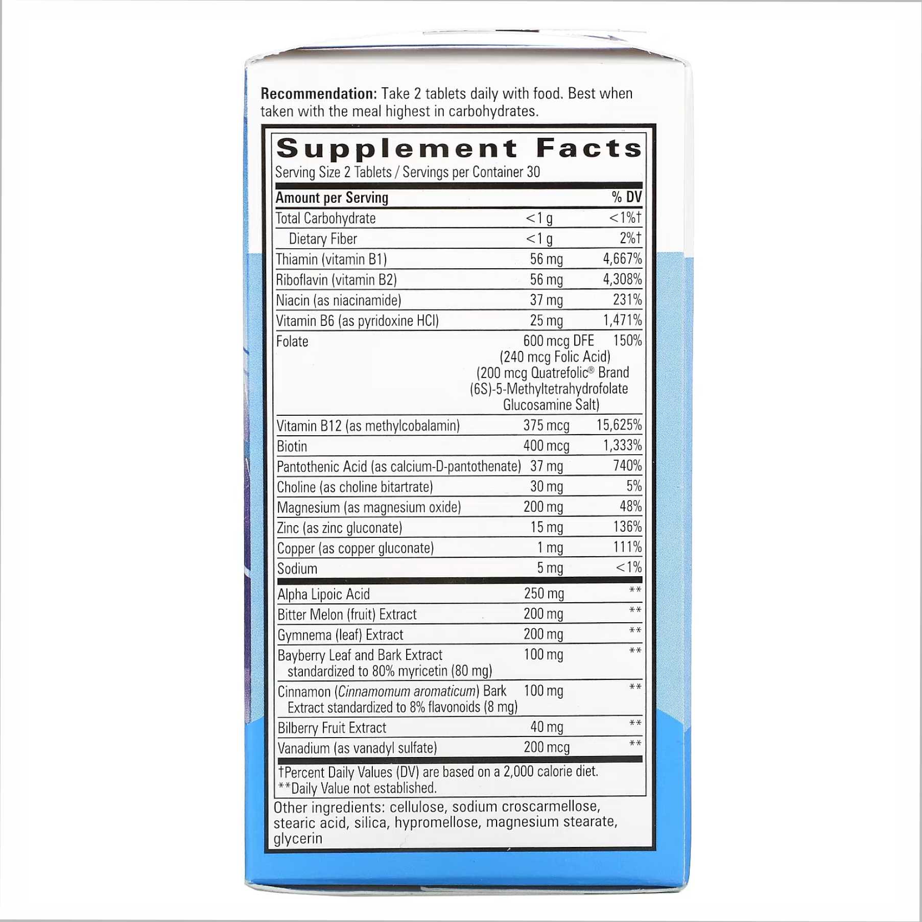 Приймати по 2 таблетки на день під час їжі. Найкраще приймати під час їжі з високим вмістом вуглеводів.