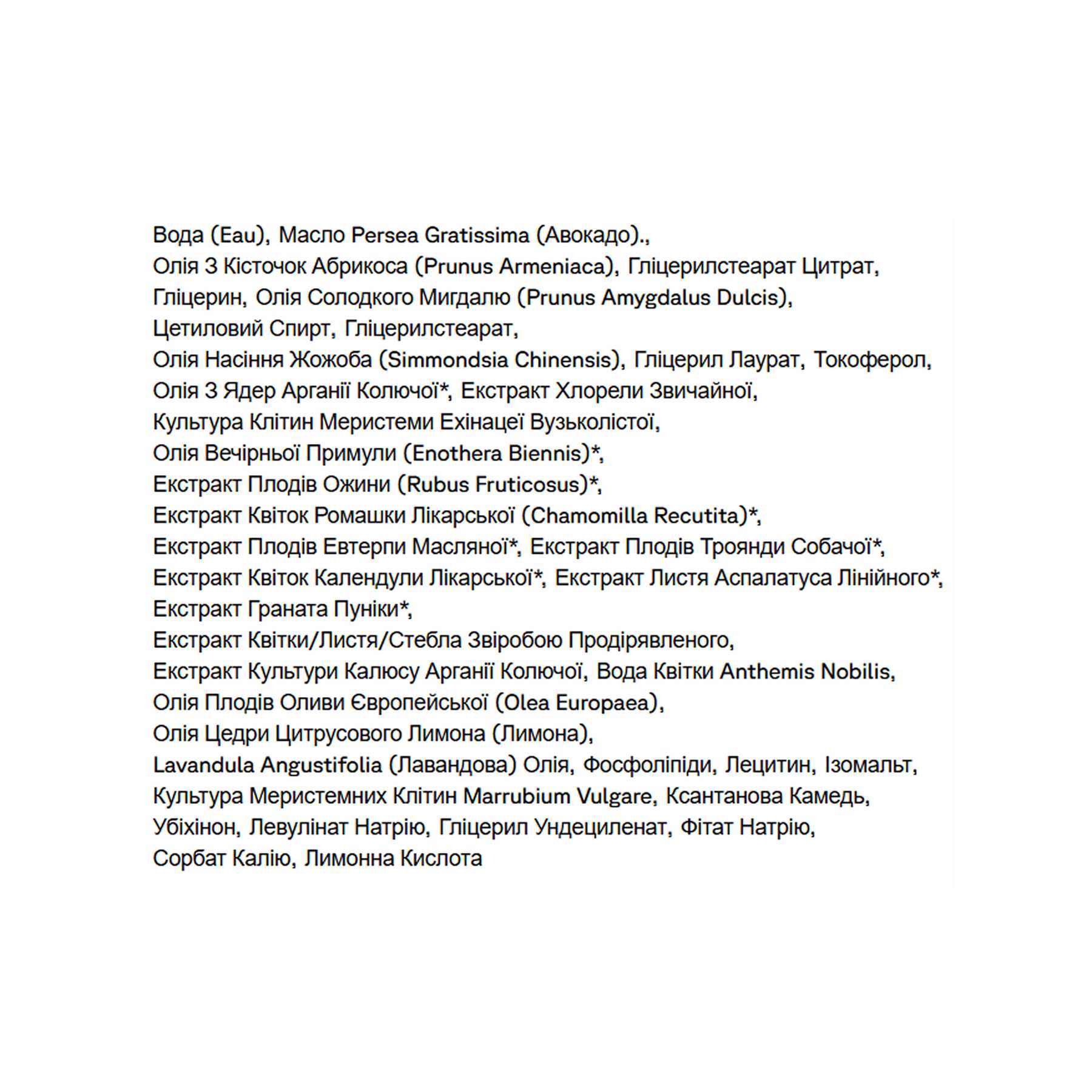 Вода, олія авокадо (Persea gratissima), олія з кісточок абрикоса (Prunus armeniaca), гліцерил стеарат цитрат, гліцерин, олія солодкого мигдалю (Prunus amygdalus dulcis), цетиловий спирт, гліцерил стеарат, олія з насіння жожоба (Simmondsia chinensis), гліцерил лаурат, токоферол, олія з ядер арганії (Argania spinosa)*, екстракт хлорели звичайної (Chlorella vulgaris)., культура меристемних клітин ехінацеї вузьколистої (Echinacea angustifolia), олія примули вечірньої (Oenothera biennis)*, екстракт плодів ожини (Rubus fruticosus)*, екстракт квіток ромашки (Chamomilla recutita)*, екстракт ягід асаї (Euterpe oleracea)*, екстракт плодів троянди (Rosa canina)*, екстракт квіток календули (Calendula officinalis)*, екстракт листя аспалату (Aspalathus linearis)*, екстракт граната (Punica granatum)*, екстракт квіток/листя/стебел звіробою (Hypericum perforatum), екстракт калусної культури арганії (Argania spinosa), олія з квіток ромашки римської (Anthemis nobilis), оливкова олія (Olea europaea), олія зі шкірки лимона (Citrus limon), лавандова олія (Lavandula angustifolia), фосфоліпіди, лецитин, ізомальт, культура меристемних клітин Marrubium vulgare, ксантанова камедь, убіхінон, левулінат натрію, гліцерил ундециленат, фітат натрію, сорбат калію, лимонна кислота.