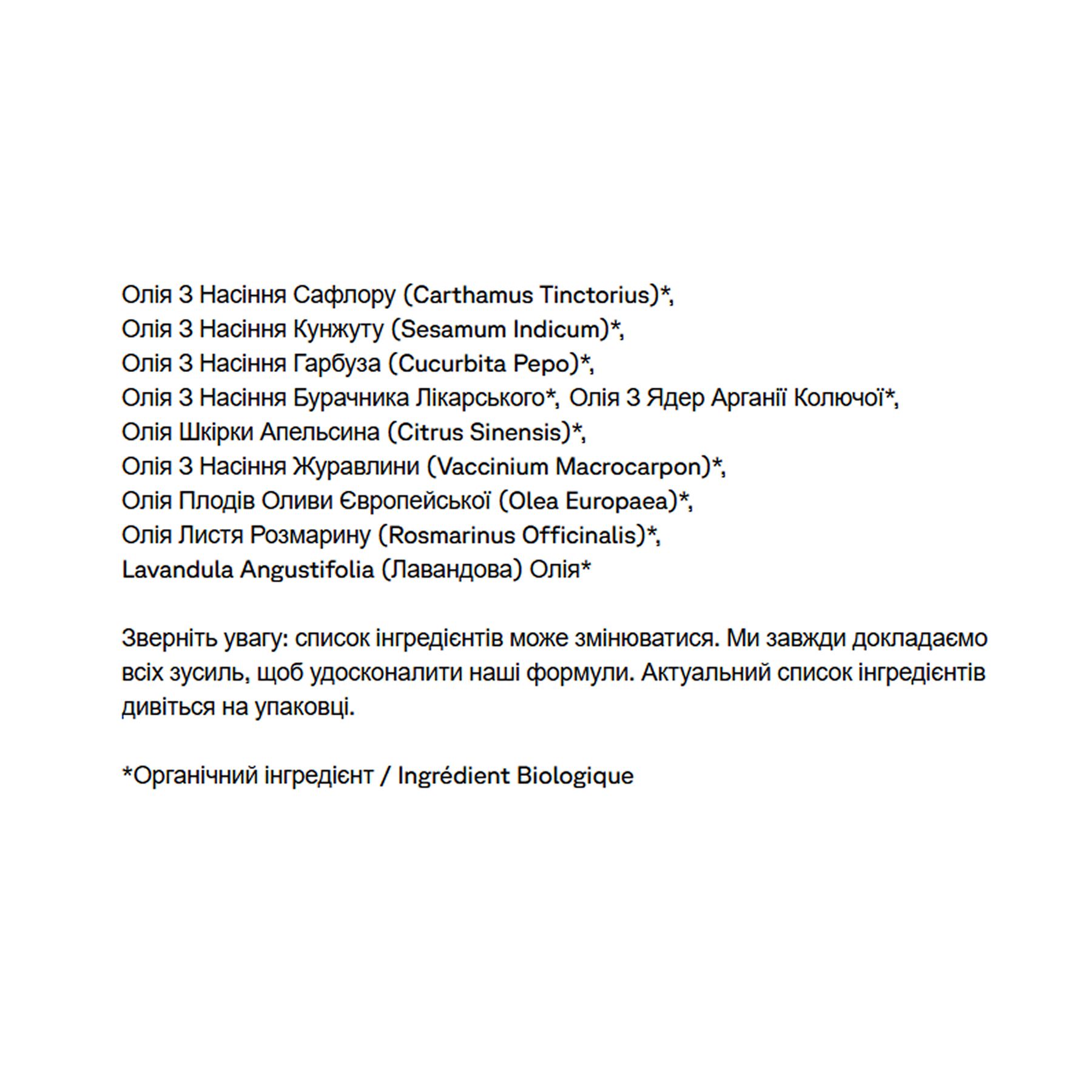 Олія з насіння сафлору (Carthamus tinctorius)*, олія з насіння кунжуту (Sesamum indicum)*, олія з насіння гарбуза (Cucurbita pepo)*, олія з насіння огірочника (Borago officinalis)*, олія з ядер арганії (Argania spinosa)*, олія з насіння журавлини (Vaccinium macrocarpon)*, олія з листя розмарину (Rosmarinus officinalis)*, оливкова олія (Olea europaea)*, олія з цедри апельсина (Citrus aurantium dulcis)*, олія лаванди (Lavandula angustifolia)*.