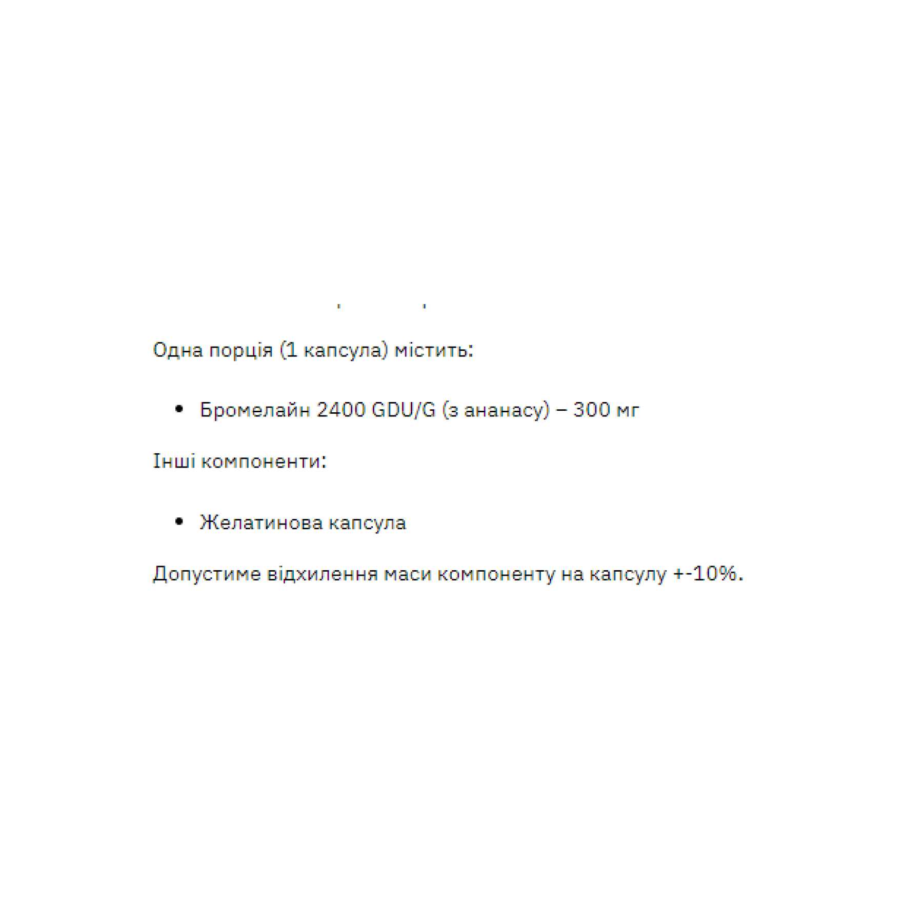 Харчова добавка містить бромелайн – є комплексом ферментів, що отримується зі стебла ананасу. Бромелайн допомагає травній системі ефективніше розщеплювати їжу.