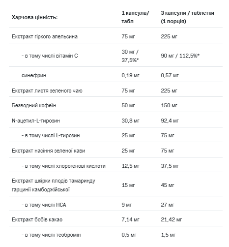 Порція 3 капсули Кількість порцій в упаковці 40 Упаковка 120 капсул ІНГРЕДІЄНТИ Burn4ALL Extreme Вміст однієї порції включаючи: % RWS * Екстракт гіркого апельсину Citrus aurantium 225 мг – включаючи витамин С. 90 мг 113% – у тому числі чаю Camellia sinensis 225 мг Безводний кофеїн 150 мг N-ацетил-L-тирозин 92,4 мг хлорогенової кислоти 37,5 мг Екстракт шкірки плодів тамаринду камбоджійської гарцинії 45 мг – включаючи HCA 27 мг у тому числі теобромін 1,5 мг