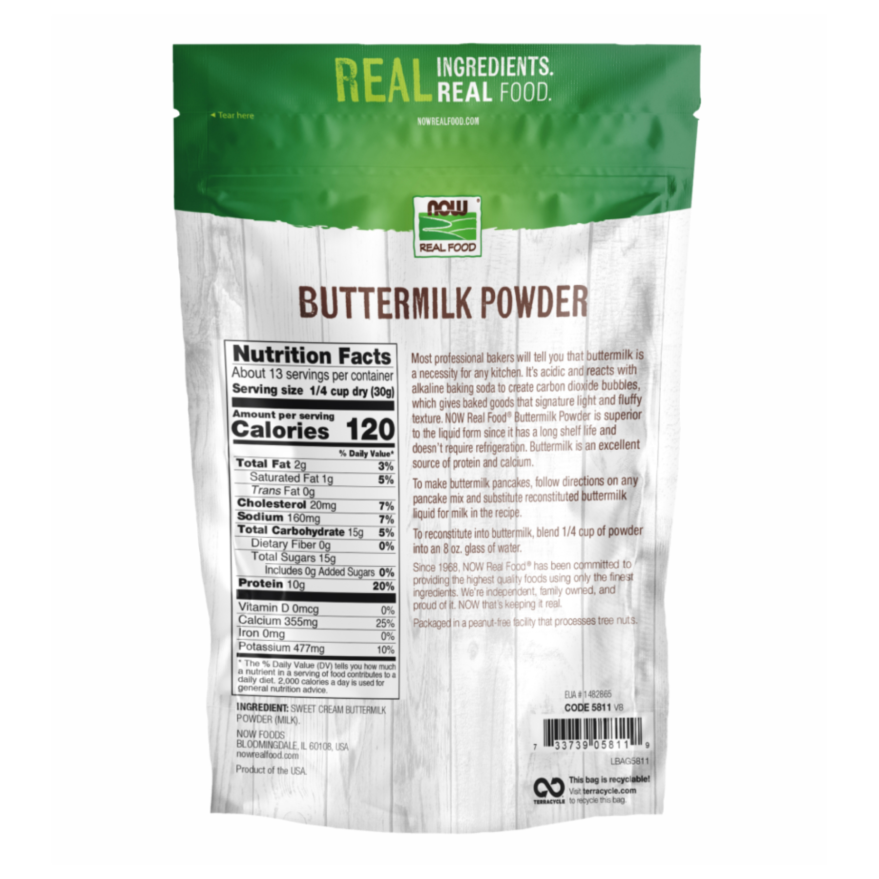 Більшість професійних пекарів скажуть вам, що пахта є необхідністю на будь-якій кухні. Він кислий і реагує з лужною харчовою содою, утворюючи бульбашки вуглекислого газу, що надає випічці фірмову легку та пухнасту текстуру. Порошок NOW Real Food® Buttermilk Powder кращий за рідку форму, оскільки він має тривалий термін зберігання та не потребує охолодження. Пахта є чудовим джерелом білка та кальцію.