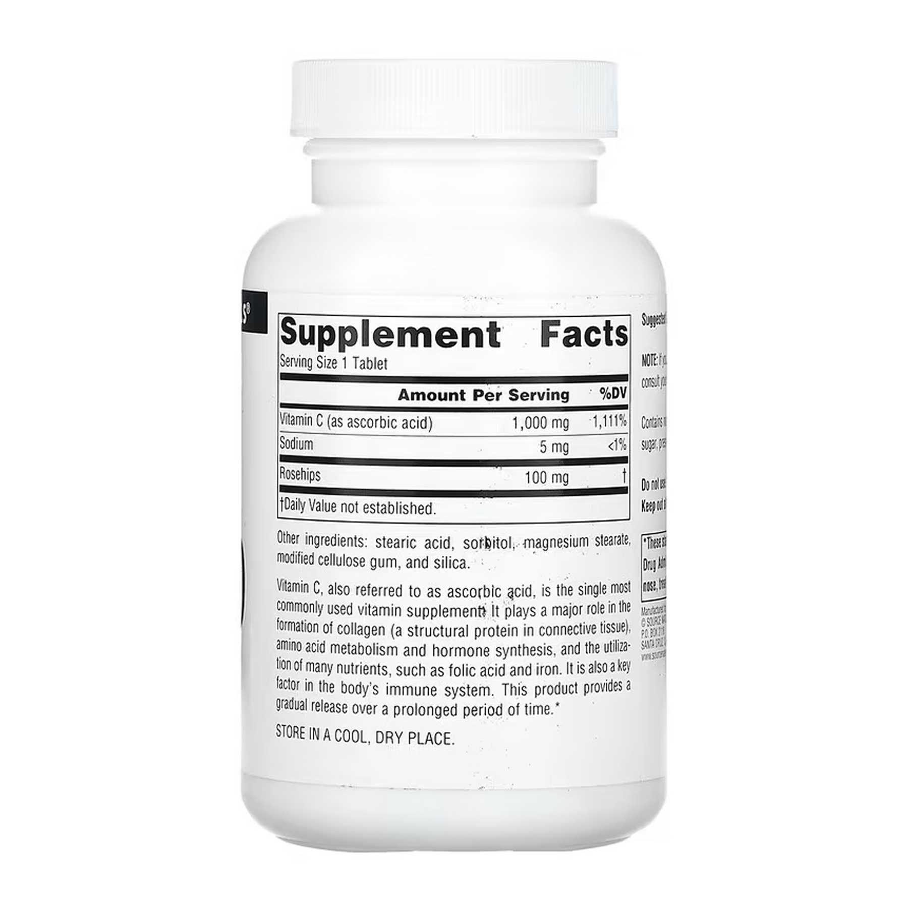 Вітамін С, також відомий як аскорбінова кислота, є найпоширенішою вітамінною добавкою. Він відіграє ключову роль в утворенні колагену (структурного білка сполучної тканини), метаболізмі амінокислот, синтезі гормонів та використанні багатьох поживних речовин, таких як фолієва кислота та залізо. Він також є ключовим фактором імунної системи організму. Цей продукт забезпечує поступове вивільнення протягом тривалішого періоду.