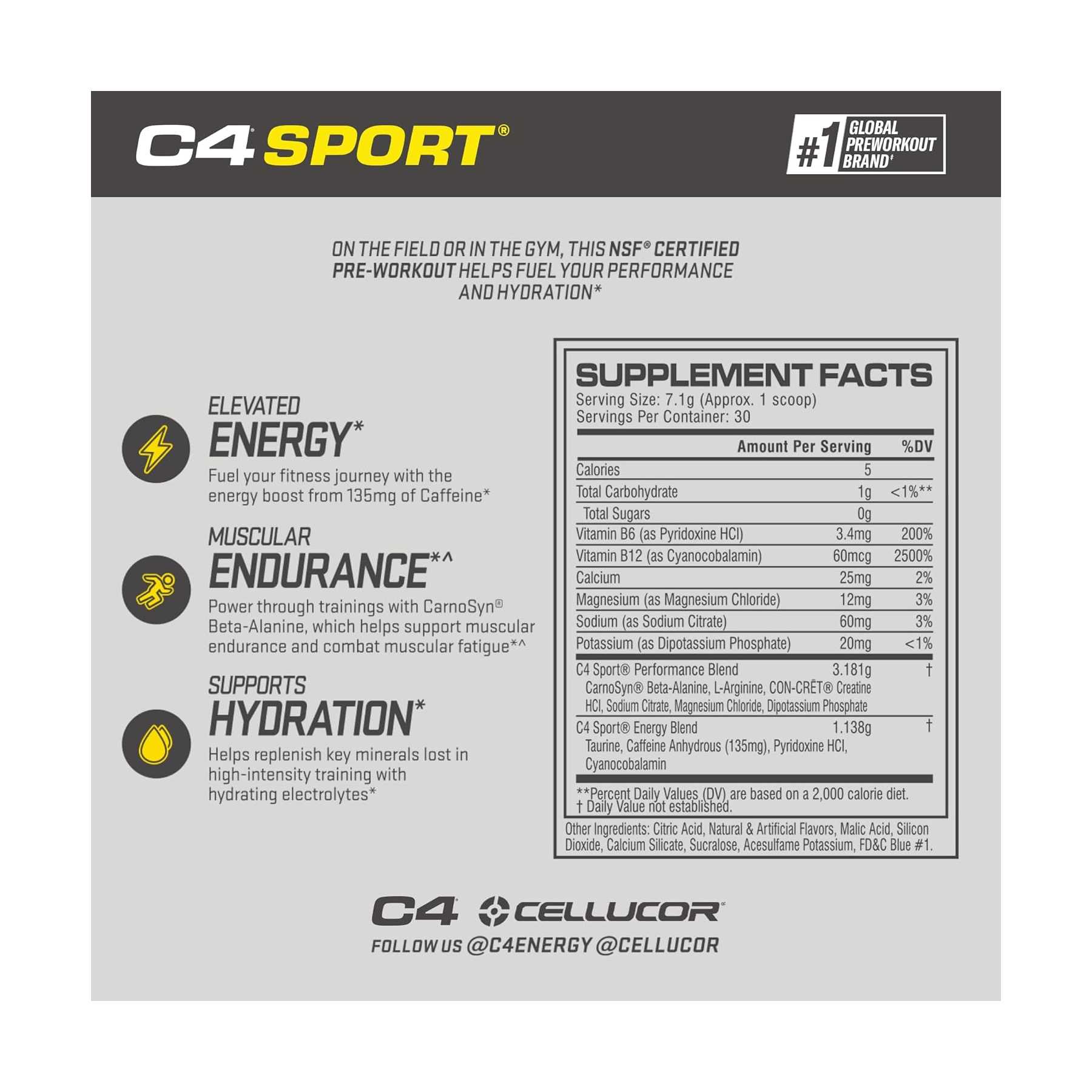 Приймайте кожну порцію (прибл. 1 мірну ложку) C4 Sport® з 240 мл (8 рідк. унціями) води та вживайте за 20–30 хвилин до тренування. Після оцінки переносимості можна приймати ще одну порцію (прибл. 1 мірну ложку) перед тренуванням^. Дослідження показали, що переваги бета-аланіну CarnoSyn® залежать від накопичувального ефекту. Щоб отримати максимальну користь, вживайте C4 Sport® принаймні протягом 8 тижнів. Деякі люди можуть відчувати легке поколювання від бета-аланіну, що не є шкідливим.