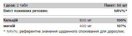 Інгредієнти: Карбонат кальцію, оксид магнію, наповнювач (мікрокристалічна целюлоза), антизлежувач (стеарат магнію).