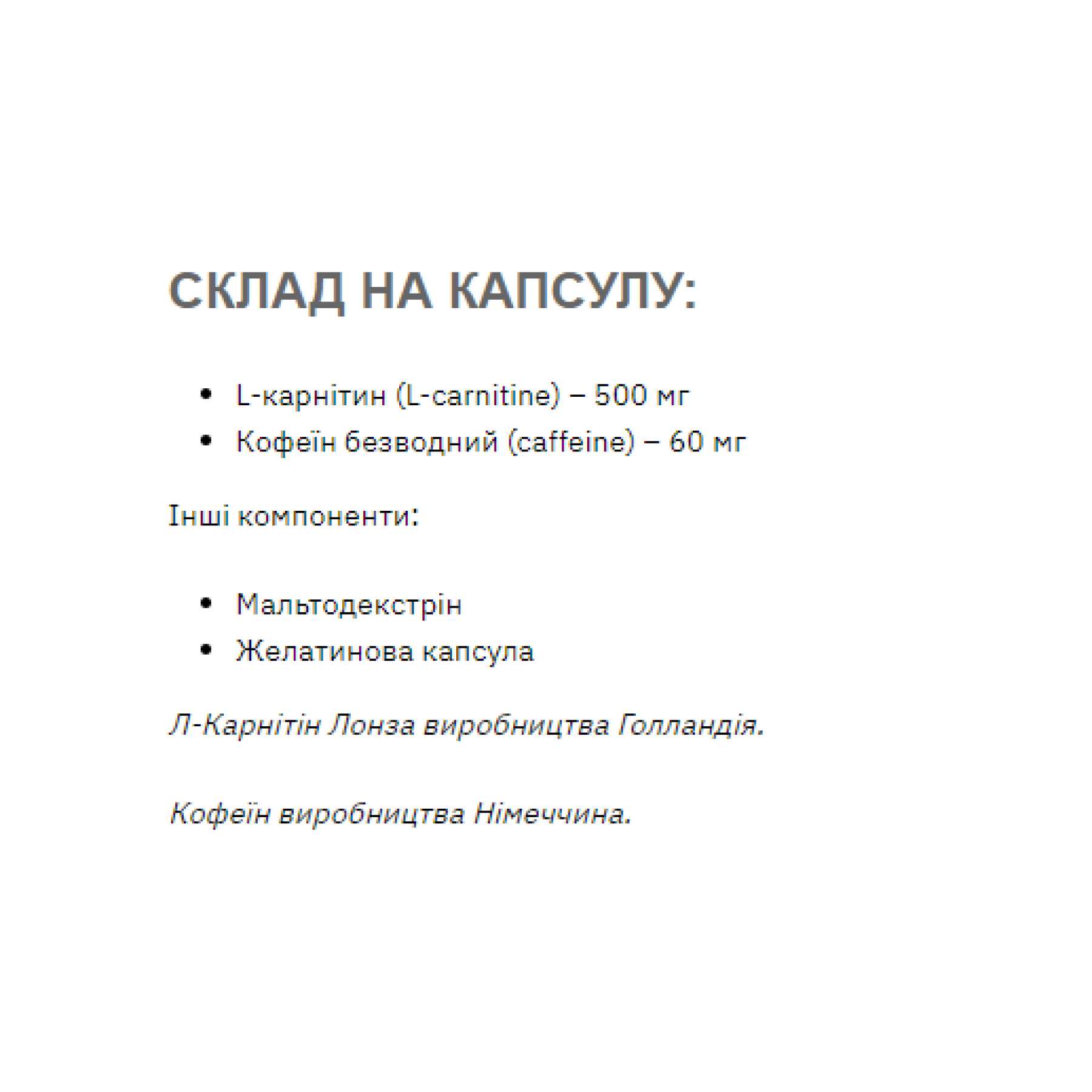L-Карнітин (L-Carnitine) – це амінокислота, природна речовина, споріднена з вітамінами групи В, є жиросжигателем. Спалювання жиру здійснює транспорт жирних кислот у мітохондріальний матрикс, де відбувається їхнє руйнування з виділенням енергії саме під час фізичних навантажень.