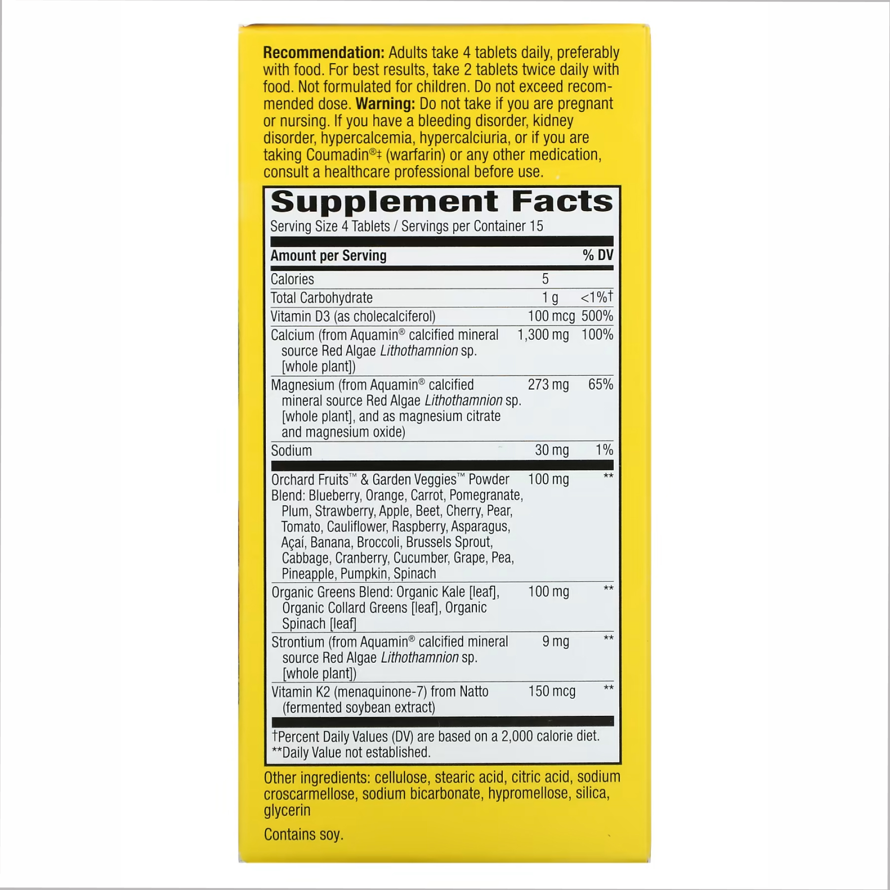 Також у складі міститься суміш фруктів та овочів, яка посилює дію кальцію, а також комплекс мінералів та вітамінів. Вітамін D необхідний для повноцінного засвоєння кальцію, блокує поділ ракових клітин, позитивно впливає стан шкіри. Вітамін D3 у комплексі з кальцієм сприяє зміцненню кісткової тканини та нормальному скороченню м'язової тканини. Вітамін К2   перешкоджає розвитку атеросклерозу та остеопорозу, а також покращує роботу серцево-судинної системи. Цей вітамін допомагає кальцію розподілятися на ті місця, де є кальцієвий дефіцит.