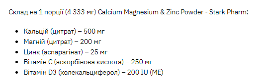Харчова добавка Calcium Magnesium & Zinc Powder містить комплекс кальцію, магнію та цинку, який надає максимально ефективну спільну збалансовану дію на організм людини.