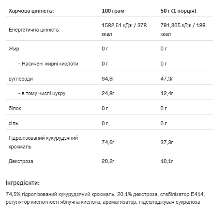Переваги Carbo Multi Max вуглеводи з різною швидкістю засвоєння; відновлює запаси енергії у м'язах; збільшує витривалість; ефективно підвищує рівень глікогену. Carbo Multi Max Carbo Multi Max – це карбо добавка, що містить вуглеводи для забезпечення організму енергією. Даний вуглеводний комплекс розроблений для спортсменів, які займаються бодібілдингом та іншими видами спорту, де потрібний високий енергетичний потенціал та концентрація глікогену у м'язах. Carbo Multi Max містить кілька видів вуглеводів з різним глікемічним індексом, тобто з різною швидкістю розщеплення, починаючи від швидких як декстроза, і, закінчуючи повільними, такими як гідролізований кукурудзяний крохмаль. Склад Carbo Multi Max Розмір порції: 1 совок (50 г) Склад на порцію Калорії 189 ккал Жири 0 г Насичені жири 0 г Вуглеводи 47,3 г Цукор 12,4 г Клітковина 0 г Білок 0 г Сіль 0 г