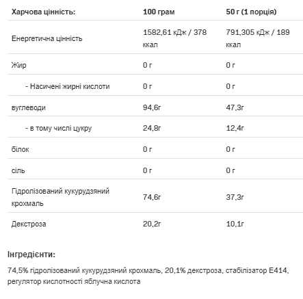 Переваги Carbo Multi Max вуглеводи з різною швидкістю засвоєння; відновлює запаси енергії у м'язах; збільшує витривалість; ефективно підвищує рівень глікогену. Carbo Multi Max Carbo Multi Max – це карбо добавка, що містить вуглеводи для забезпечення організму енергією. Даний вуглеводний комплекс розроблений для спортсменів, які займаються бодібілдингом та іншими видами спорту, де потрібний високий енергетичний потенціал та концентрація глікогену у м'язах. Carbo Multi Max містить кілька видів вуглеводів з різним глікемічним індексом, тобто з різною швидкістю розщеплення, починаючи від швидких як декстроза, і, закінчуючи повільними, такими як гідролізований кукурудзяний крохмаль. Склад Carbo Multi Max Розмір порції: 1 совок (50 г) Склад на порцію Калорії 189 ккал Жири 0 г Насичені жири 0 г Вуглеводи 47,3 г Цукор 12,4 г Клітковина 0 г Білок 0 г Сіль 0 г