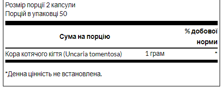 Зміцніть захисні сили свого організму за допомогою трав'яної сили котячого кігтя Swanson Full Spectrum®! Кора цієї перуанської лози багата на алкалоїдні сполуки, які забезпечують поживну підтримку здоровій імунній системі. Кожна капсула містить 500 мг чистої кори котячого кігтя.