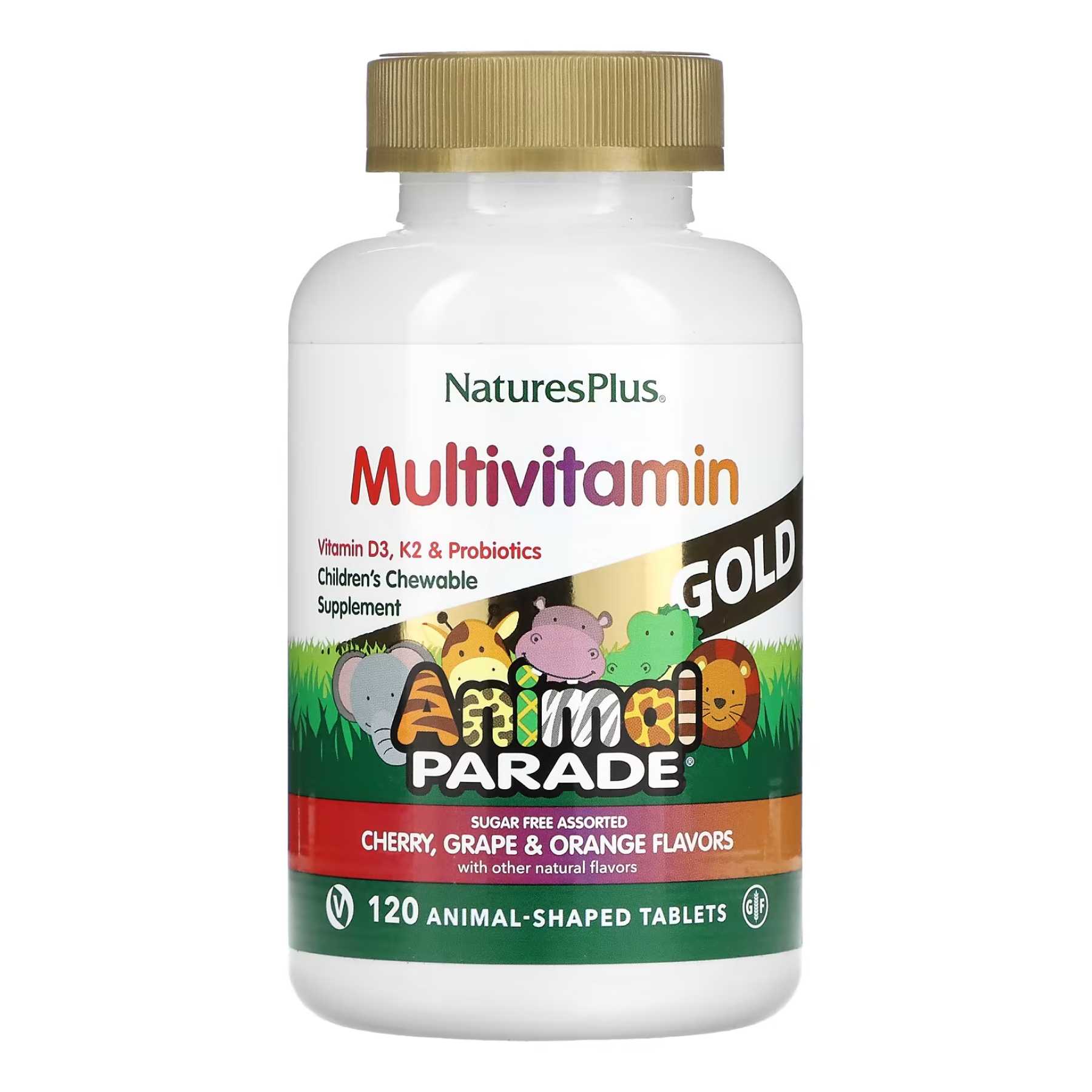 Жувальні мультивітаміни без цукру Animal Parade® Gold для дітей виводять цю популярну формулу з мультивітамінами та мікроелементами на новий рівень! Кожна порція цих забавних жувальних таблеток у формі тварин з неповторними натуральними смаками вишні, апельсина та винограду тепер містить 500 МО вітаміну D3, підвищену дозу мікроелементів, ферментів, пробіотиків і безліч натуральних цільних продуктів.