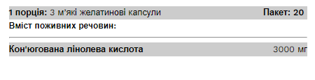 CLA – це дієтична добавка в м'яких желатинових капсулах, що містить кон'юговані лінолеві кислоти. Одна порція продукту містить 3000 мг кон'югованої лінолевої кислоти.