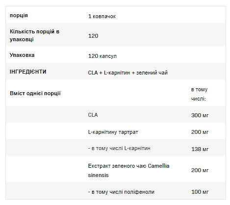 CLA + L-CARNITINE + GREEN TEA – біологічно активна добавка для фізично активних людей, що містить кон'юговану лінолеву кислоту (CLA), L-карнітин та екстракт зеленого чаю.