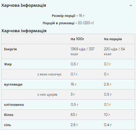 Додайте 1 порцію (16 г) приблизно 300-400 мл холодної води і добре струсіть, щоб порошок розчинився. Дайте природній піні осісти після струшування і насолоджуйтесь протеїновим напоєм. Ви можете налаштувати кількість води, щоб знайти кращу концентрацію.