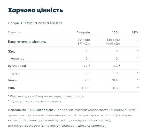 Clear Whey Isolate – це не просто ще один протеїновий коктейль. Ми взяли високоякісний гідролізований ізолят сироваткового протеїну та створили легку та освіжаючу альтернативу – це більше схоже на сік, ніж на молочний протеїновий коктейль. І у нього чудовий смак, з безліччю смаків на вибір, включаючи гіркий лимон, апельсинове манго, персиковий чай, мохіто та райдужні цукерки. 20 г білка Легкий та освіжаючий Без молочного смаку або текстури 4 г BCAA та 3 г глутаміну З низьким вмістом цукру Фруктові аромати Кожна смачна порція містить 20 г білка, який допомагає наростити та підтримувати важливі м'язи, що важливо незалежно від ваших цілей у фітнесі. А всього 0,1 г жиру, 0,3 г цукру і менше 90 калорій на коктейль – це ідеальний спосіб уникнути зневоднення протягом дня – не зводячи нанівець усієї вашої важкої роботи. Склад: гідролізат сироваткового протеїну (молоко) (96%), натуральний ароматизатор, кислота (лимонна кислота), регулятор кислотності (фосфорна кислота), протиспівні агенти (диметилполісілоксан, діоксид кремнію), підсолоджувач (сукралоза).
