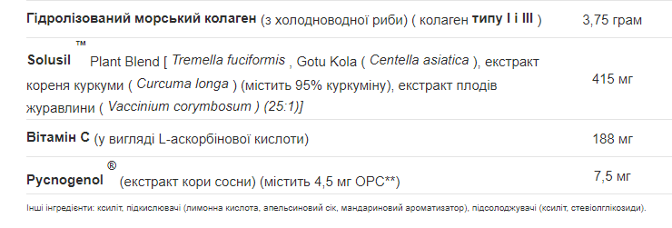 KAL® Clinical Youth Collagen™ може допомогти підтримати здоров’я шкіри, волосся, нігтів і суглобів. Наш гідролізований рибний колаген містить колаген типу I та III з дикої холодноводної риби. Це чистий білок, що складається з 18 різних амінокислот. Solusil™ — це суміш поживних речовин, відомих своєю живильною підтримкою здоров’я шкіри, волосся, нігтів і суглобів. Вітамін С необхідний для синтезу колагену, а Пікногенол був вивчений на його антиоксидантний потенціал. Clinical Youth Collagen™ легко змішується та чудово смакує завдяки натуральному смаку мандарина. Спробуйте сьогодні, і завтра ви станете більш молодими.