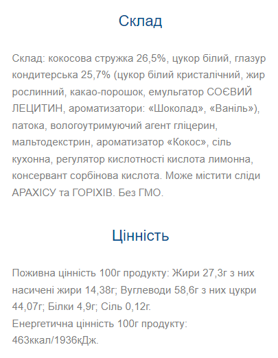 Кокосова стружка 26,5%, цукор, глазур кондитерська 25,7% (цукор білий кристалічний, жир рослинний, какао-порошок, емульгатор соєвий лецитин, ароматизатори: “Шоколад”, “Ваніль”), патока, вологоутримуючий агент гліцерин, ароматизатор “Кокос”, сіль кухонна харчова, регулятор кислотності лимонна кислота, консервант сорбінова кислота. Може містити сліди арахісу та горіхів. Без ГМО.