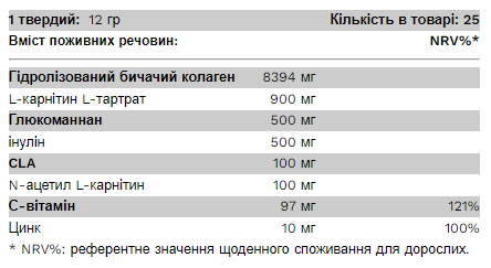 Склад:  гідролізований яловичий колаген, L-карнітин, L-тартрат, регулятор кислотності (лимонна кислота), глюкоманнан, інулін, аромат, барвник (буряковий червоний), порошок CLA, N-ацетил-L-карнітин, підсолоджувачі (ацесульфам К, сукралоза). ), L-аскорбінова кислота, хлорид натрію, оксид цинку.