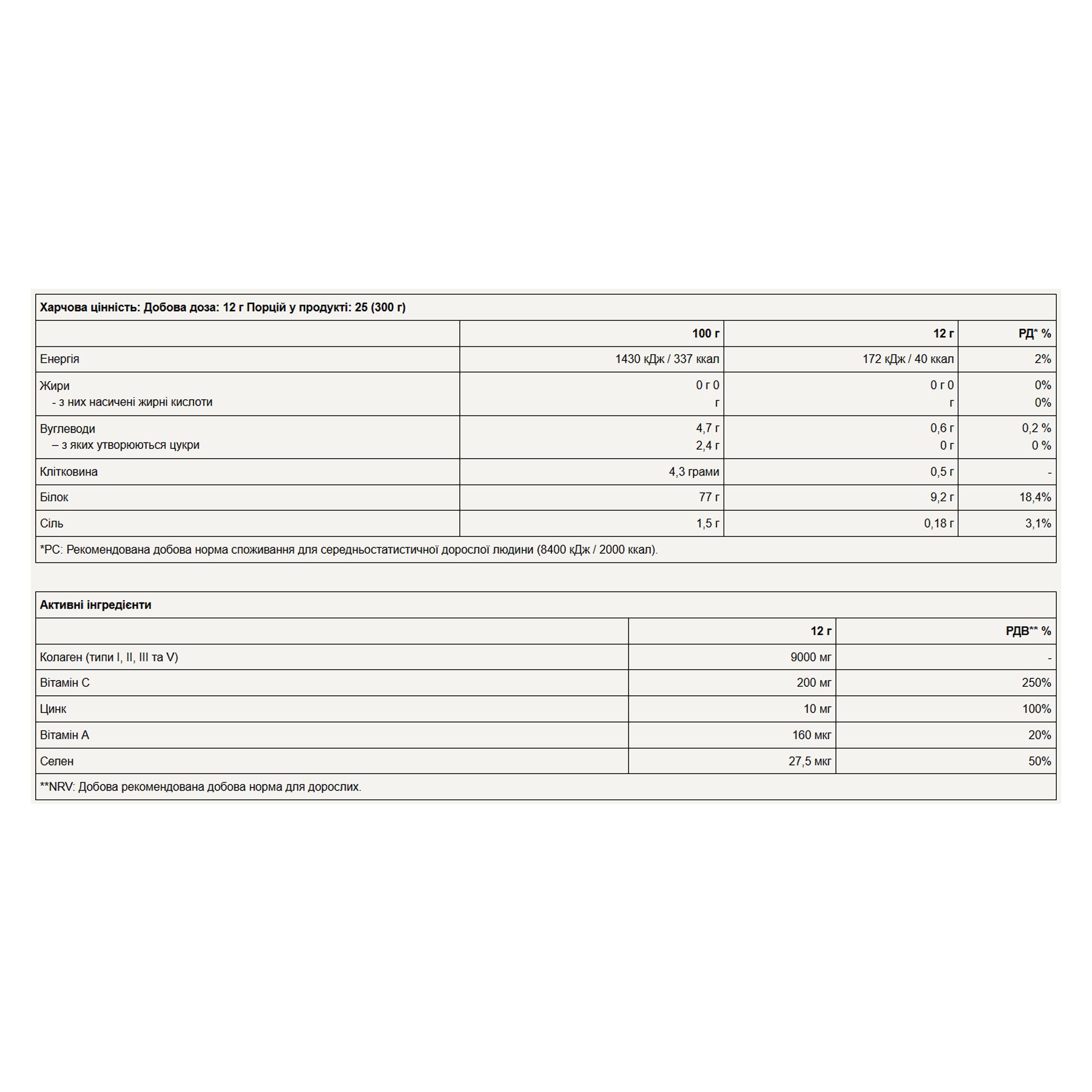 Без цукру: <0,5 г цукру/100 мл готового до вживання продукту, приготованого на воді. Щонайменше 20% енергетичної цінності їжі походить з білка. Вітамін С сприяє нормальному утворенню колагену і, таким чином, підтримці нормального стану та функції хрящів. Цинк та білок сприяють підтримці нормального стану кісток. Цинк та селен сприяють підтримці нормального волосся. Вітамін А та цинк сприяють підтримці нормального стану шкіри. Вітамін А та цинк сприяють підтримці нормального зору. Вітамін А, цинк, вітамін С та селен сприяють нормальній роботі імунної системи.