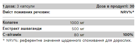 Капсула дієтичної добавки з додаванням вітаміну С, що містить 1000 мг колагену та 500 мг екстракту ашвагандхи на порцію.