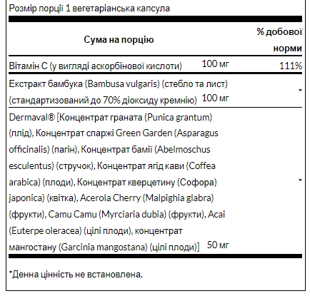 Унікальною для цієї формули є Dermaval®, клінічно вивчена комбінація дев’яти рослин-суперпродуктів, включаючи гранат, каму-каму, асаї та інші, призначена для боротьби з розпадом колагену та еластину. Камю-каму, зокрема, пропонує численні харчові переваги у вигляді фітохімічних речовин, таких як лейцин і бета-каротин, а також високий рівень вітаміну С для підтримки синтезу колагену та забезпечення антиоксидантного захисту.