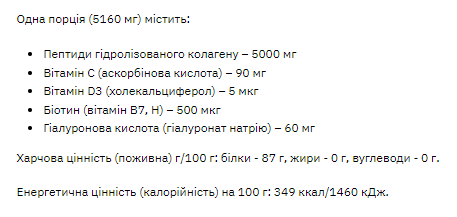 Колаген є складним структурним білком, який зберігає силу і гнучкість у всьому тілі. Це основний компонент у сполучних тканинах (сухожиллях, хрящах, кістках). Основне завдання – це догляд та турбота за шкірою, ефективно сприяє її омолодженню, пружності та підтримці еластичності якомога довше. Цей білок збільшує гідратацію шкіри від 21% до 50%. Також він захищає м'які тканини, поєднуючи їх зі скелетом. Він збільшує міцність нігтів, рухливість та гнучкість суглобів, пружність шкіри.