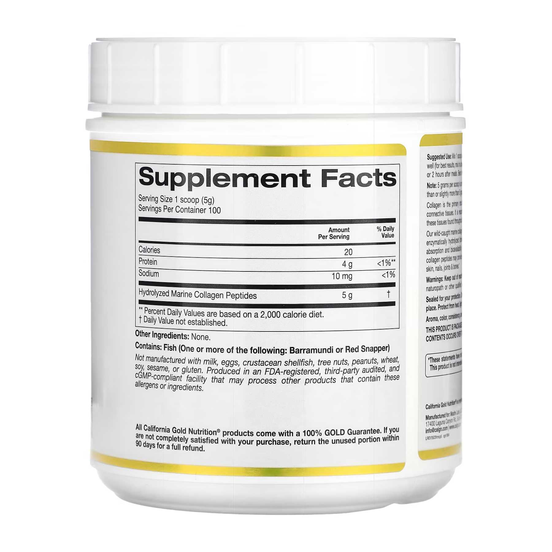 Пептиди гідролізованого морського колагену California Gold Nutrition містять морський колаген, який виробляється зі шкіри глибоководних і холодноводних видів риби, виловленої в природному середовищі, без добавок. Колаген гідролізується ферментами (розщеплюється) на амінокислотні пептиди, що сприяє засвоєнню та біодоступності.