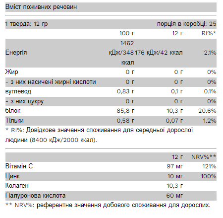 Склад: гідролізований яловичий колаген, регулятор кислотності (лимонна кислота), гідролізований колаген морської риби, аромат, барвник, аскорбінова кислота, харчова сіль, гіалуронова кислота, підсолоджувачі (ацесульфам-К, сукралоза), оксид цинку.