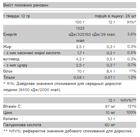 Інгредієнти (Шоколадний лісовий горіх): гідролізований пептид колагену яловичини, концентрат молочної сироватки  з перехресним мікрофільтром [емульгатор: соняшниковий лецитин], нежирний какао-порошок (10-12%), гідролізований пептид колагену морської риби, аромат (шоколад, лісовий горіх) , загусник (ксантанова камедь), L-аскорбінова кислота, кухонна сіль, підсолоджувачі (ацесульфам К, сукралоза), гіалуронова кислота, оксид цинку.
