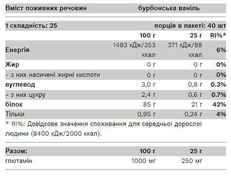 Інгредієнти (Бурбонська ваніль): ізолят сироваткового протеїну (емульгатор: соняшниковий лецитин), перехресний мікрофільтрований молочний ізолят, аромат (солона карамель), L-глутамін, хлорид натрію, загусник (ксантанова камедь), підсолоджувачі (ацесульфам К, сукралоза), барвник ( сульфіт амонію ірис).