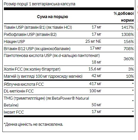 Сприяє здоровій нервово-м'язовій функції Сучасна комбінація поживних речовин заспокоює нервово-м'язову чутливість Містить вітаміни групи B, магній, триметилгліцин та багато іншого. Підтримуйте здорову функцію нейротрансмітерів за допомогою ексклюзивної формули Swanson Fibro Essentials! До його складу входить яблучна кислота, що забезпечує здорове постачання м'язів киснем, та магній, що допомагає їх розслабити. Містить метіонін, триметилгліцин, вітаміни групи В та багато іншого Рекомендації щодо застосування: як харчова добавка приймайте по одній рослинній капсулі на день, запиваючи водою.